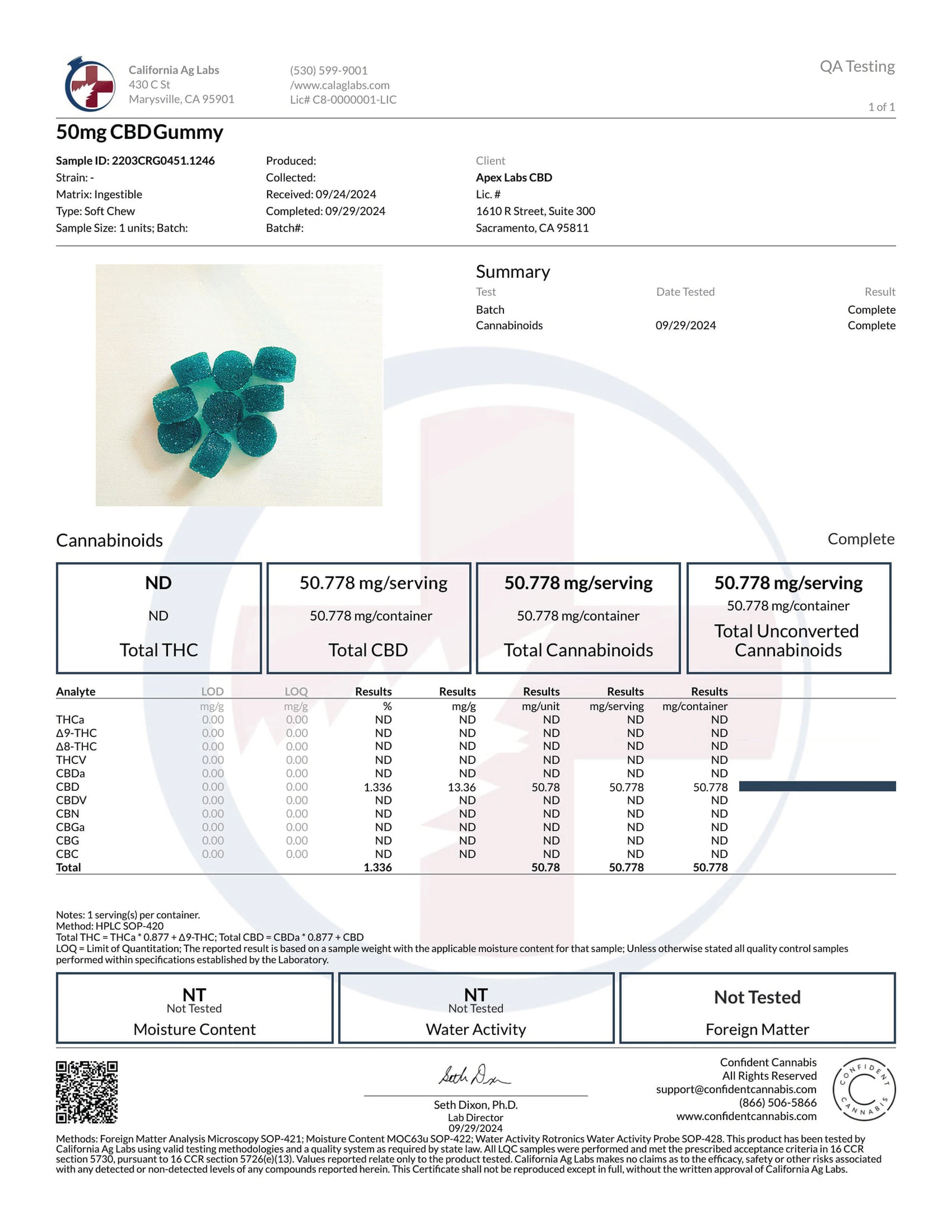 Organna CBD is committed to providing full transparency from outlined details on each ingredient used in our formulations to a full lab test on all CBD used in our product manufacturing. The results of a lab test are called a Certificate of Analysis, or COA and are performed by 3rd party certified laboratories. A Certificate of Analysis helps to certify that a manufacturer’s products are grown, extracted, and manufactured to specification. The COA will reveal the exact quantity of each specific cannabinoid, terpene, and other compounds found in each product, such as CBD. Below shows a glimpse at the main components of this product’s COA. To view the full test results, click on the COA image above.